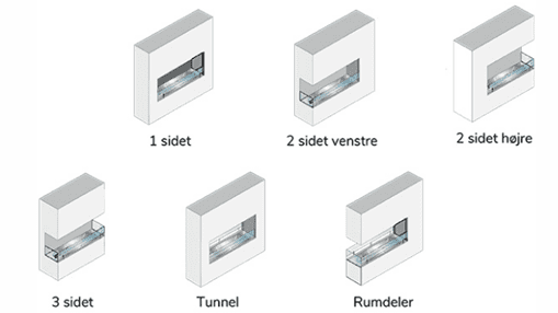 Omramningen kan designes efter dine ønsker og behov. Skal biopejsen fx stå op af en væg eller som en rumdeler? Du kan se forskellige forslag til inspiration på billedet herunder. Efterfølgende kan omramningen males, pudses eller beklædes med materialer som akustikpaneler, tapet, læder eller andet for at passe perfekt ind i din indretning.