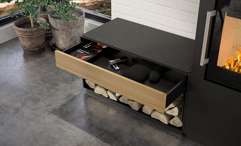 Du har mulighed for selv at tilpasse, hvordan modulopbygningen omkring din HWAM® 5530 skal se ud. Der kan tilkøbes et høje, lave, brede og smalle moduler, og modulerne kan fås med skuffefronter i eg og valnød. Der kan desuden tilkøbes en filthynde, så du kan bruge din HWAM® 5530 opstilling som en hyggekrog.
