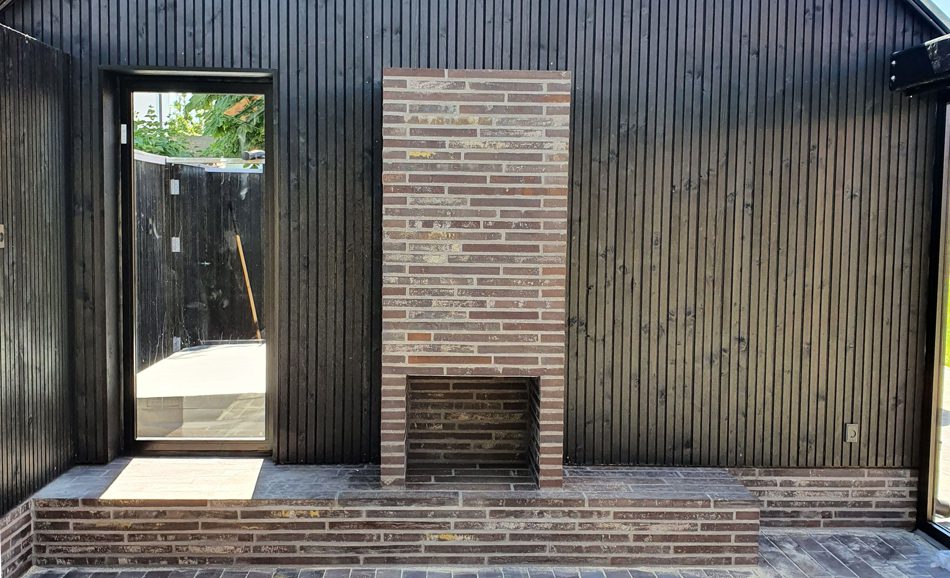 I denne sag fra Skagen har kunden fået et lækkert, åbent ildsted i en muret opbygning i det nyopførte orangeri. Der er brugt den samme mursten både indvendigt og udvendigt. Murstenen er en Kolumba – hårdt brændt – mursten.