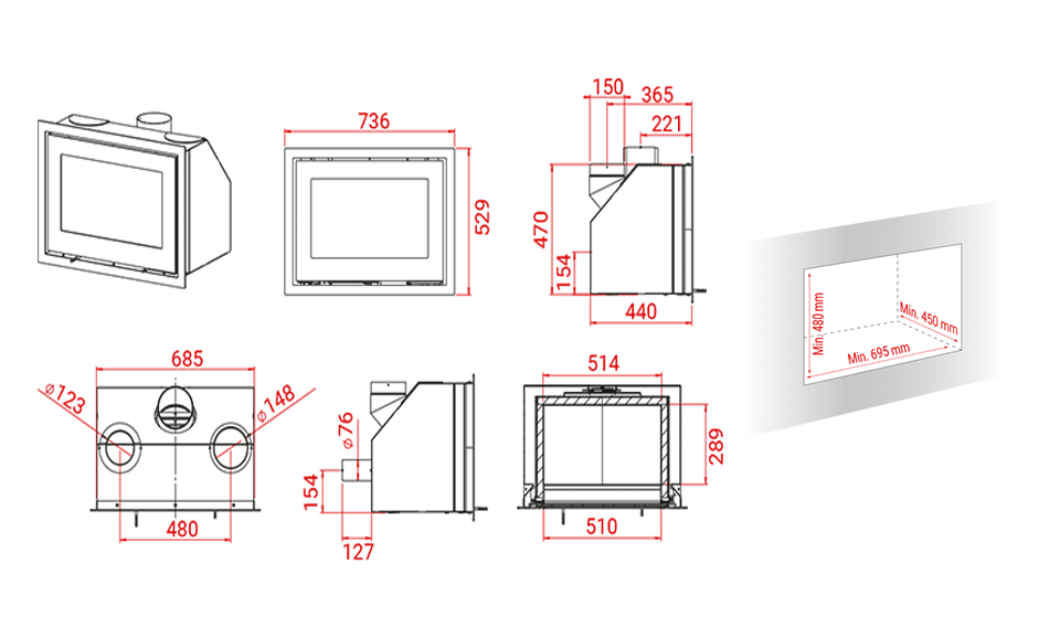 En klassisk 1-sidet pejseindsats til indbygning forsyner din stue med et hyggeligt skær fra flammerne. Desuden har Lotus H470 et effektivt konvektionssystem. Nederst trækker den luft ind, som den leder bag om brændkammeret. Derefter ledes, den nu opvarmede, luft ud i toppen af ovnen.