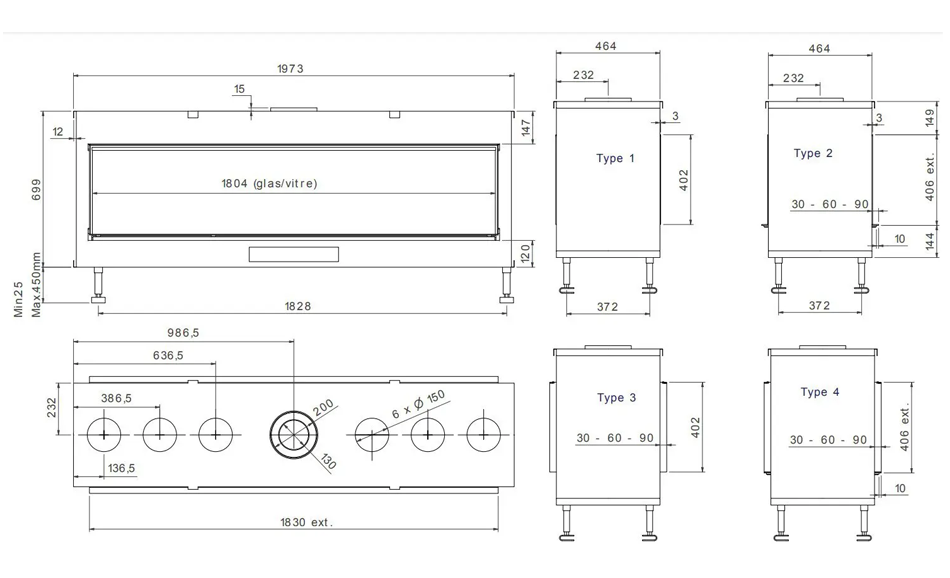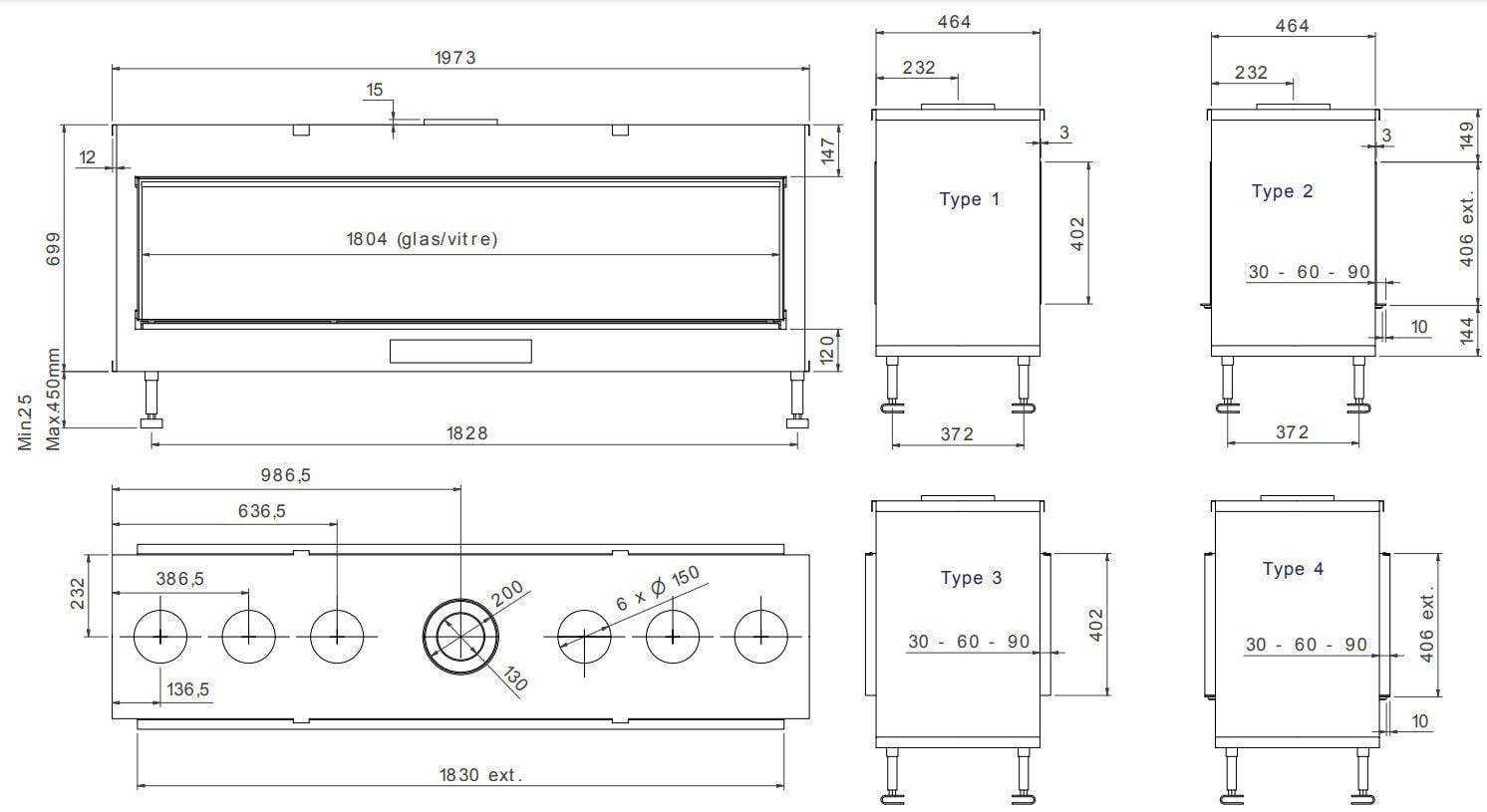 Bunden af pejsen dækkes med glasstykker, sten eller keramiske brændestykker. De indvendige sider kan beklædes med sort spejlglas, metal eller støbejern. Gaspejse kræver balanceret aftræk. Denne model er beregnet til indbygning af brændhæmmende plader. Efterfølgende kan pladerne beklædes med et materiale efter dit valg.