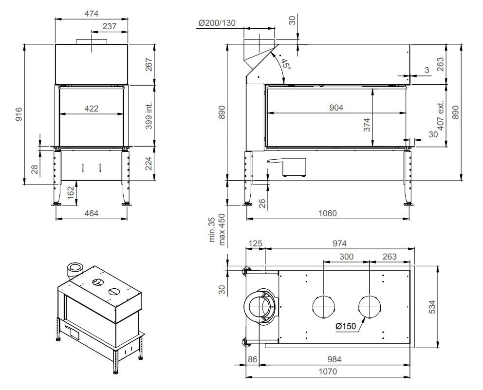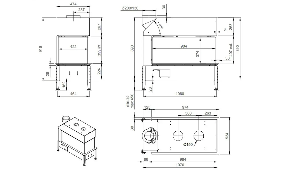 Til beklædning af den udvendige side, kan der vælges mellem støbejern, metal eller sort spejlglas. Bunden af pejsen kan dækkes af glasstykker og sten. Der er også mulighed for at tilkøbe keramiske brændestykker.