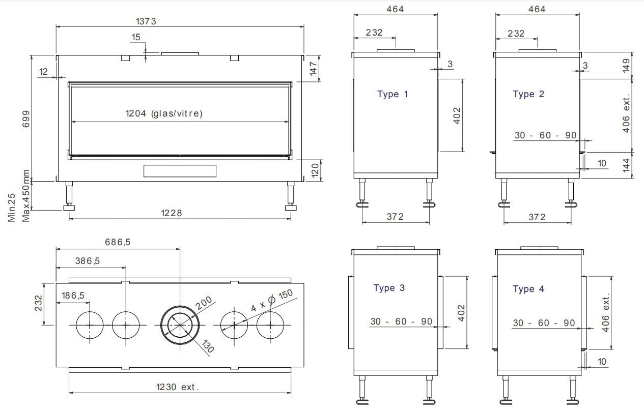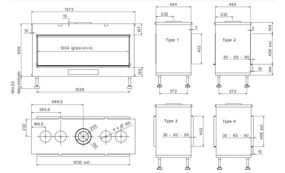 Du kan mellem tre typer brændere: Single-, Double- eller Trible Line. Double Line giver det dybeste bål, mens Trible Line giver det bredeste bål. Det helt rigtige look skabes ved at placerer glasstykker, sten eller keramiske brændestykker i bunden af pejsen. De indvendige sider beklædes med sort spejlglas, metal eller støbejern.
