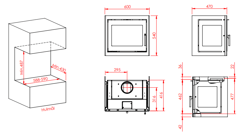 Jupiter 470 med fast glas er en elegant pejseindsats. Modellen er beregnet til indbygning, og den skal tilsluttes en velfungerende og korrekt dimensioneret skorsten.