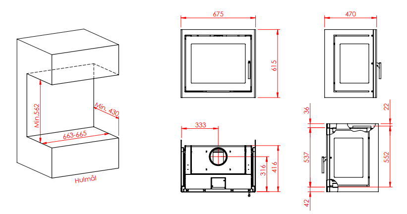 Jupiter 550 med fast glas på 2 sider er en stilren pejseindsats. Modellen er beregnet til indbygning, og den skal tilsluttes en velfungerende og korrekt dimensioneret skorsten.