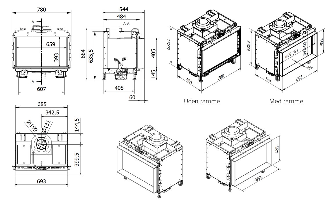 I bunden af RAIS VISIO 70 F er der placeret keramiske brændestykker, som sammen med flammerne giver et realistisk og smukt bål. For et helt klart kig til bålet, anbefaler vi at du tilvælger antirefleks glas. Det minimerer genskin fra lamper og lysindfald frem vinduer. Der er desuden mulighed for at tilkøbe rammer i sort eller rustfri stål.
