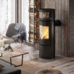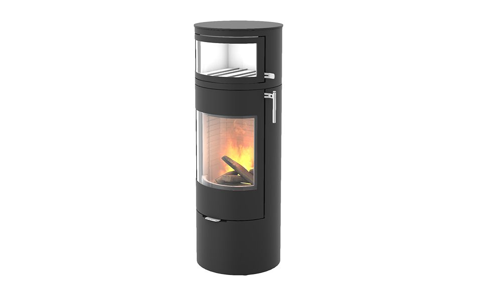Brændeovnen har et moderne og skulpturelt udseende. Den har en buet låge, så du kan nyde flammerne fra en bredere vinkel.