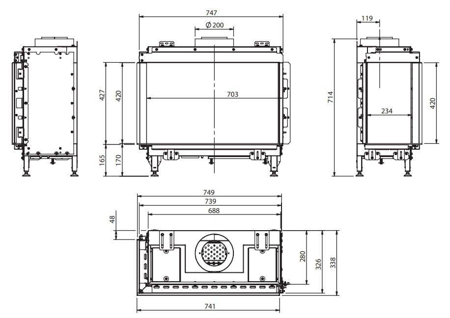 ELEMENT4 SUMMUM 70C er en 2-sidet hjørne gaspejs, der er beregnet til indbygning. Den kræver et balanceret aftræk ud gennem taget eller en ydermur. Modellen leveres med den nyudviklede Real Flame Burner, der giver et både flot og realistisk bål. I pejsen er der keramiske stykker træ, og de indvendinger sider er udført i metal.