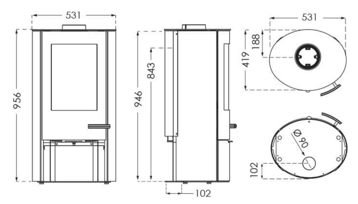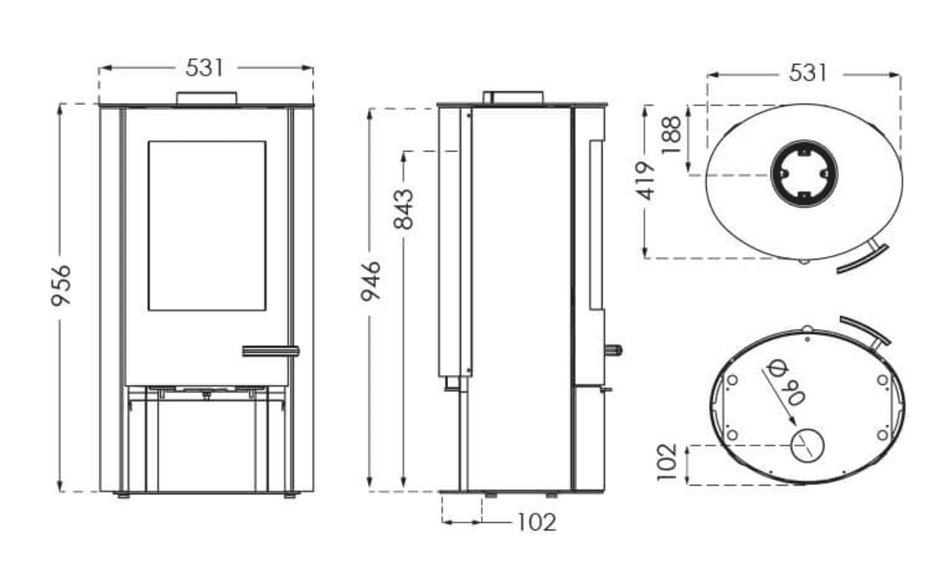 TERMATECH TT20BAZIC R har tilslutning til din skorsten på toppen eller på bagsiden. Den leveres med rund låge, der har et ventileret håndtag. Glasset i den runde låge giver et godt kig til bålet, og det ventilerede håndtag sikrer, at du ikke brænder fingrene, når du skal åbne lågen.
