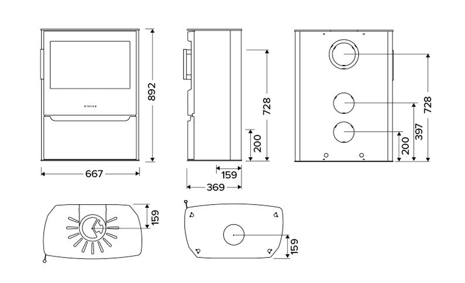 WIKING® Maxi 4 måler 89,2 cm i højden, 66,7 cm i bredden og 36,3 cm i dybden. Brændkammerets bredde er mellem 48,5 og 52,2 cm, hvilket giver plads til større brændestykker. Der er mulighed for tilslutning af friskluftsystem både bagtil og i bunden med en diameter på 100 mm.